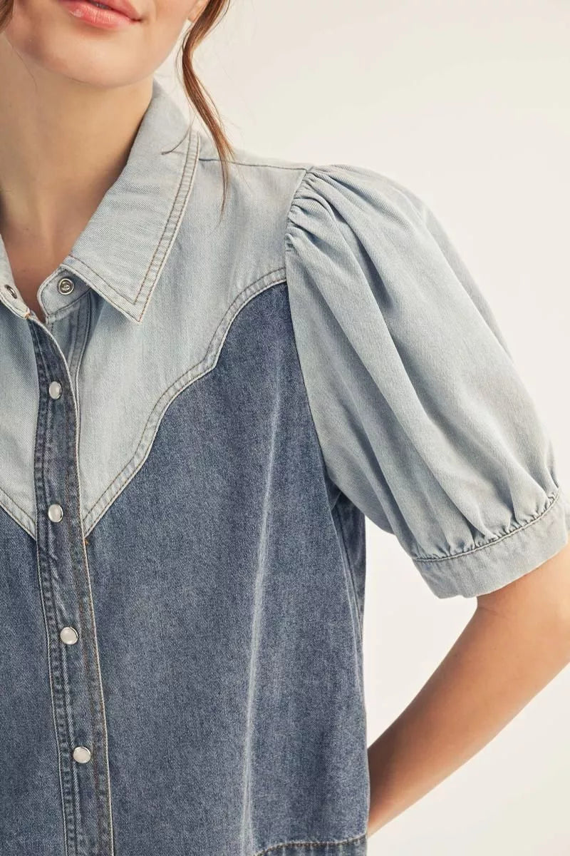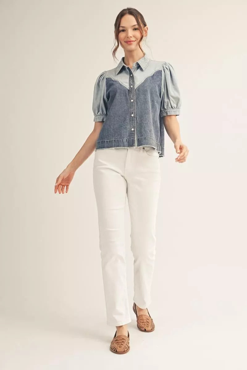 Short puff sleeves button down washed denim top, denim fabric mix, collared neckline.