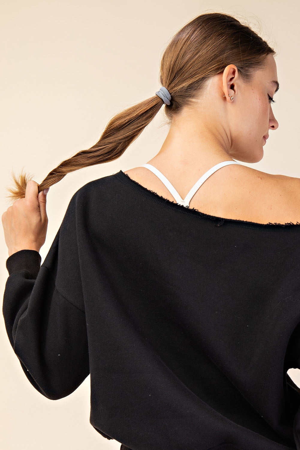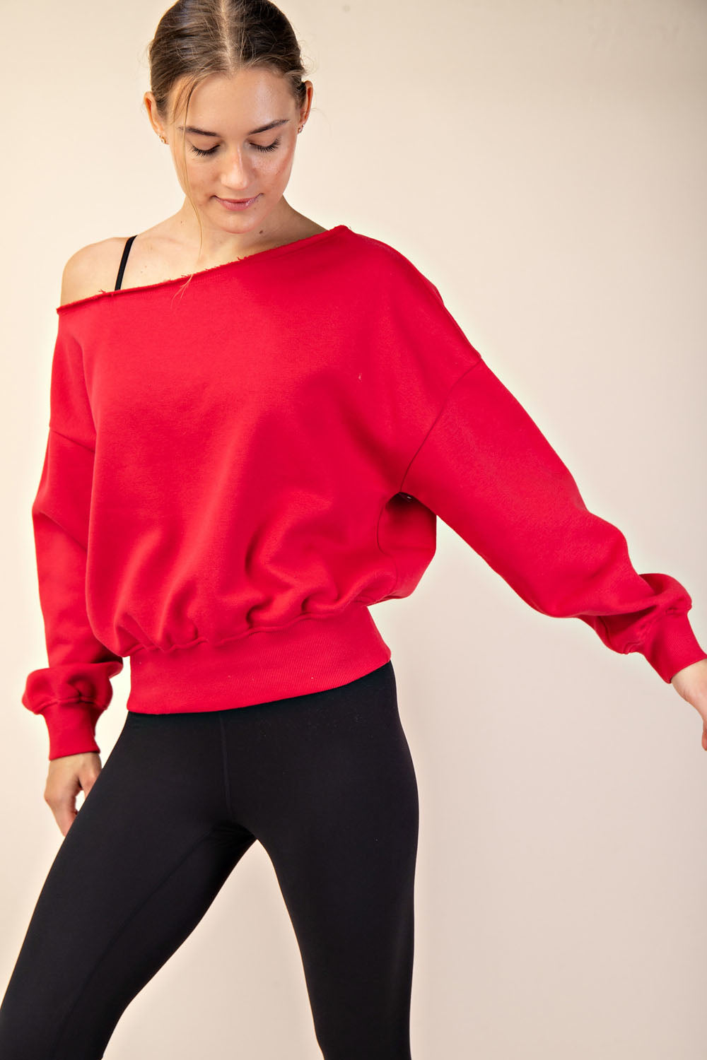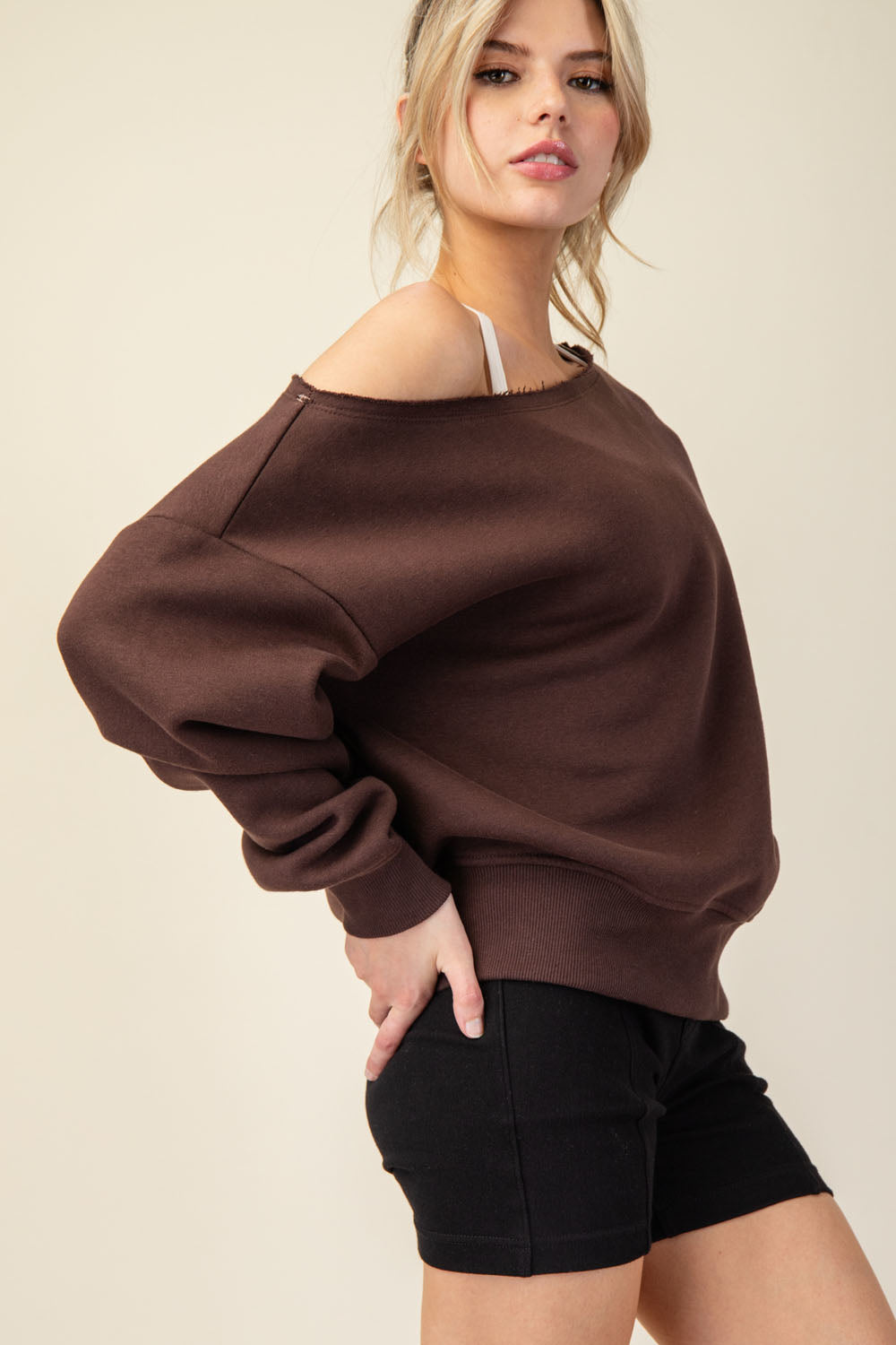 Introducing the Right Where You Are Top, crafted from luxurious French terry with a brushed interior for ultimate comfort. The slouchy, oversized fit and unique raw-edged asymmetrical neckline bring together casual chic and effortless elegance. Perfect for any occasion with stylish dropped shoulders and ribbed cuffs and hem.