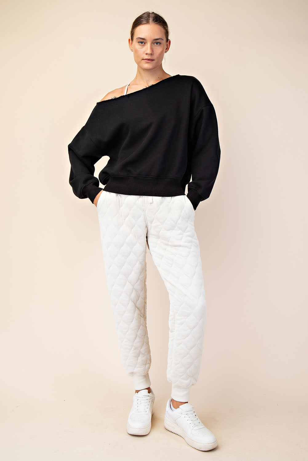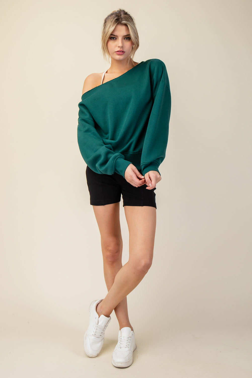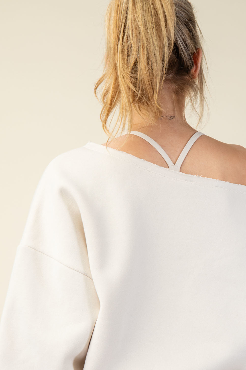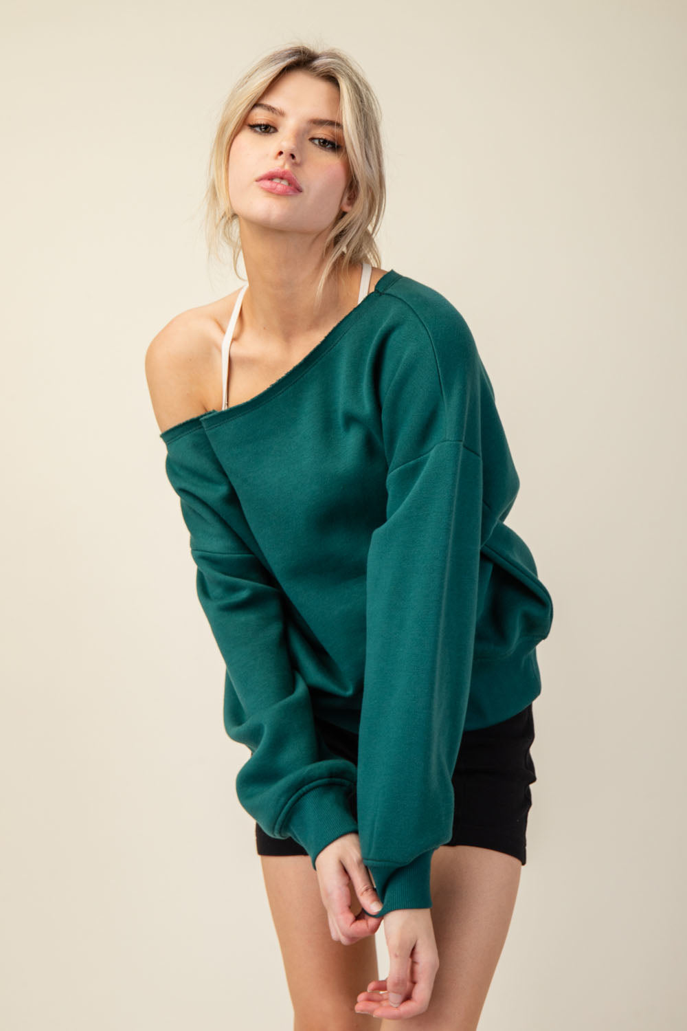 Introducing the Right Where You Are Top, crafted from luxurious French terry with a brushed interior for ultimate comfort. The slouchy, oversized fit and unique raw-edged asymmetrical neckline bring together casual chic and effortless elegance. Perfect for any occasion with stylish dropped shoulders and ribbed cuffs and hem.