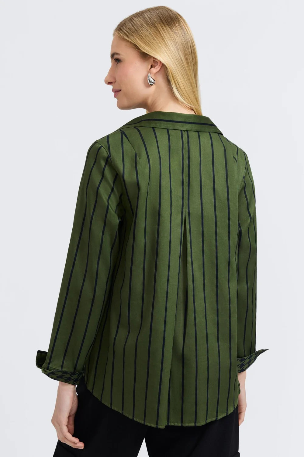Agnes is all about simplified elegance, with a relaxed silhouette and a clean print placement that lets the stripes flow uninterrupted. When the neckline drapes open, the print continues for a polished, pulled-together look — while houndstooth accents under the collar and cuffs add a hidden pop of personality. It’s the kind of shirt that does laid-back and dressed-up with equal confidence.