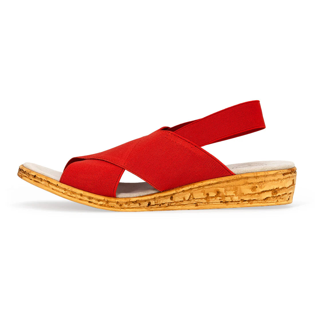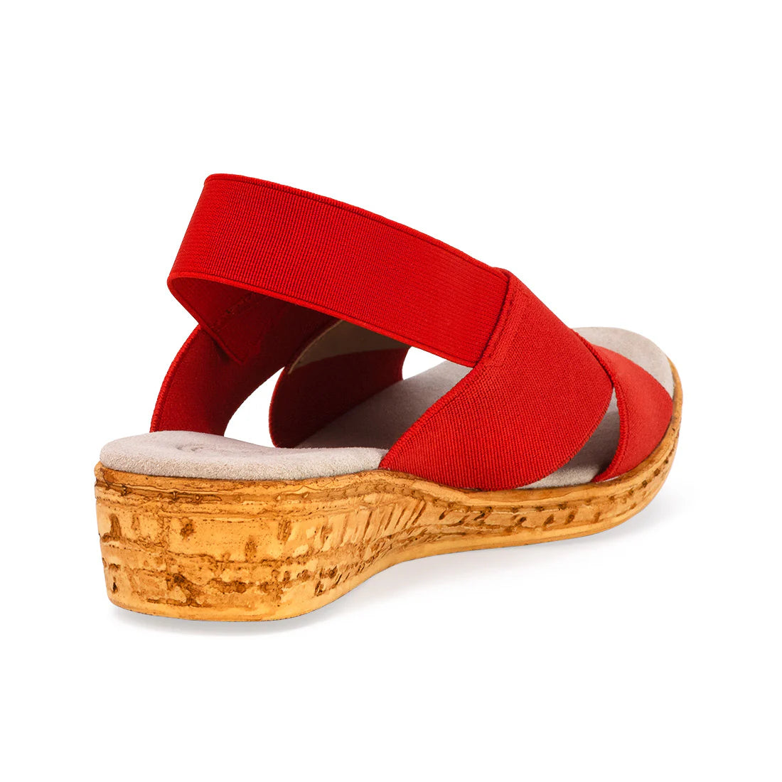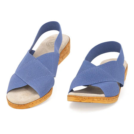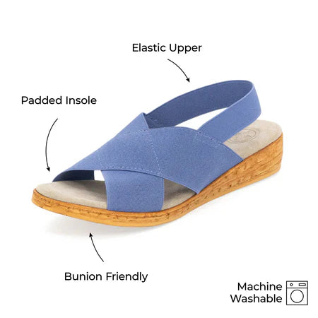 Stretch upper, crisscross straps, sling back, cork-like bottom