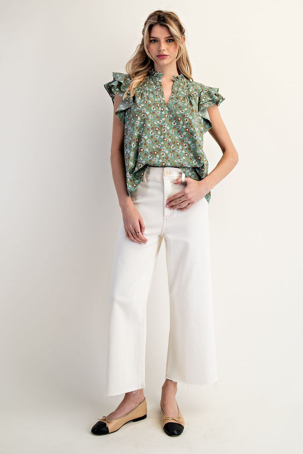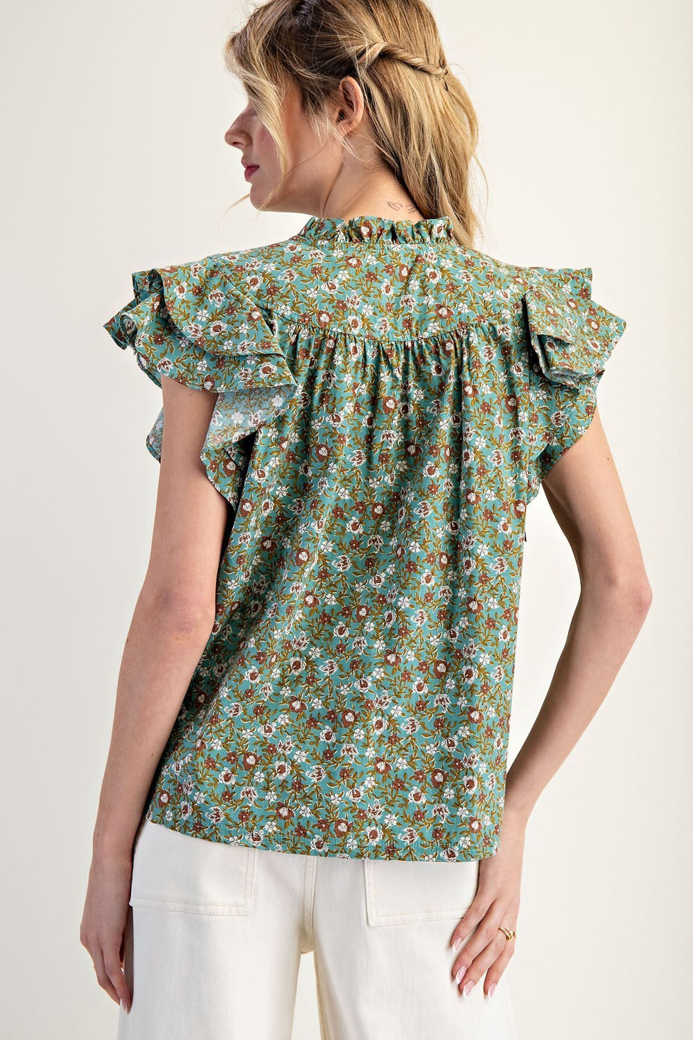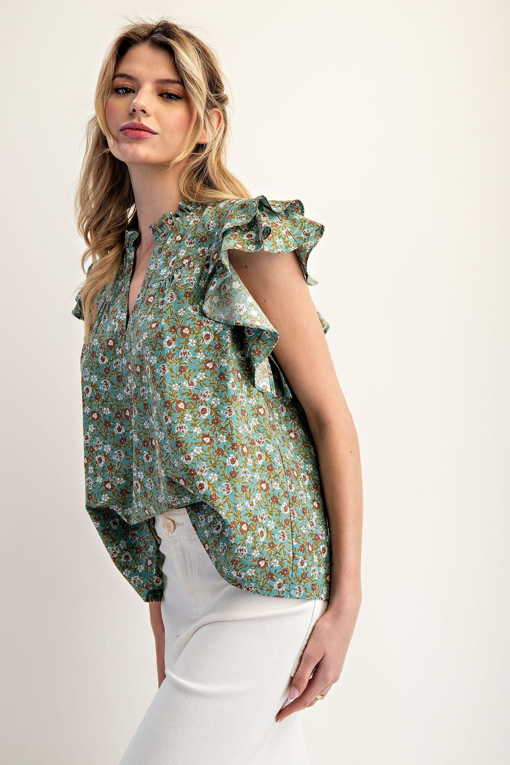 This Beautiful Feelings Top boasts a vintage inspired floral print with a ruffled mock neckline, notched front opening, layered flutter sleeves, and gathered back yoke detailing. The breezy and feminine silhouette is perfect for a romantic and stylish look.