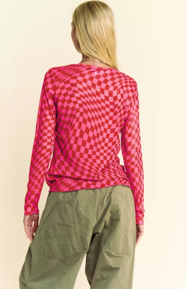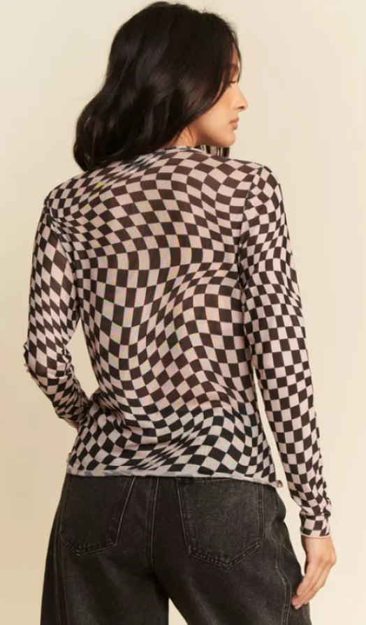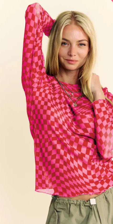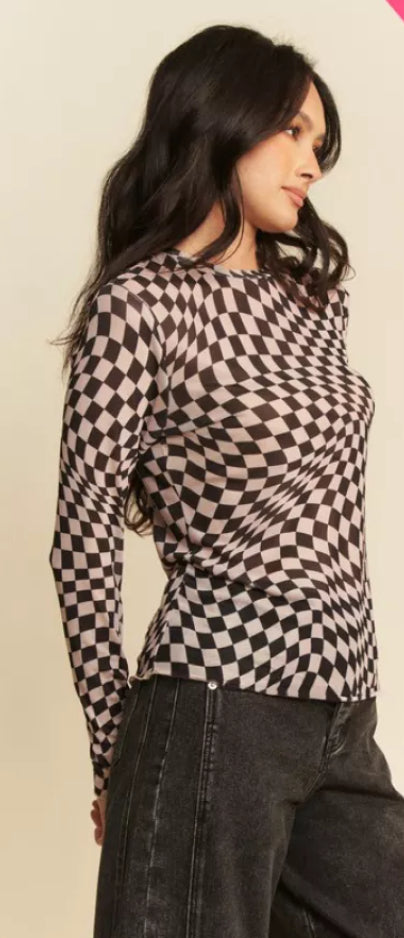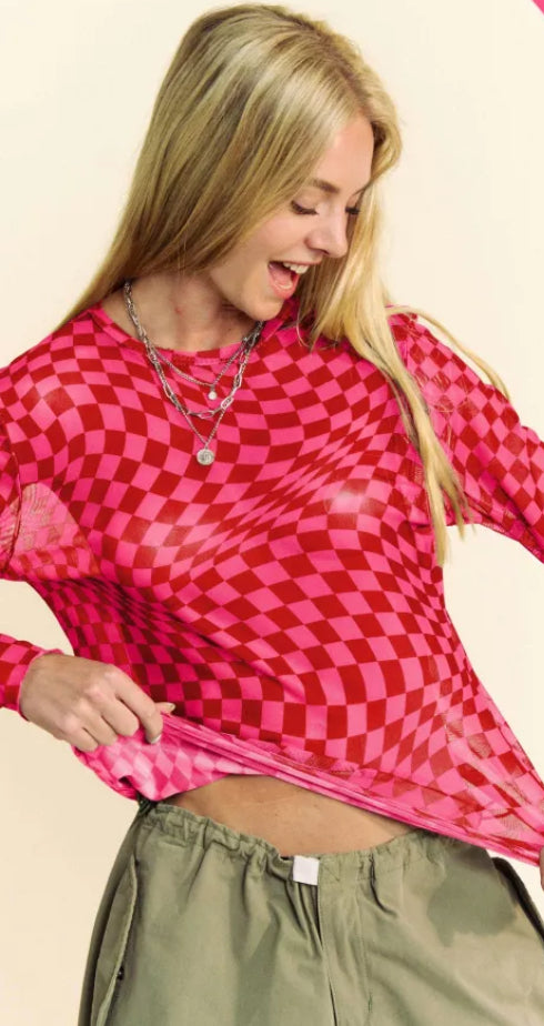 Crafted from premium quality mesh fabric, this Checkered Burnout Top features a bold checker board print, adding a touch of edginess to your wardrobe. The long sleeves provide added coverage, while the lightweight fabric offers comfort and breathability. Made with 92% polyester and 2% spandex, this top is both stylish and durable. Perfect for showcasing your unique style.