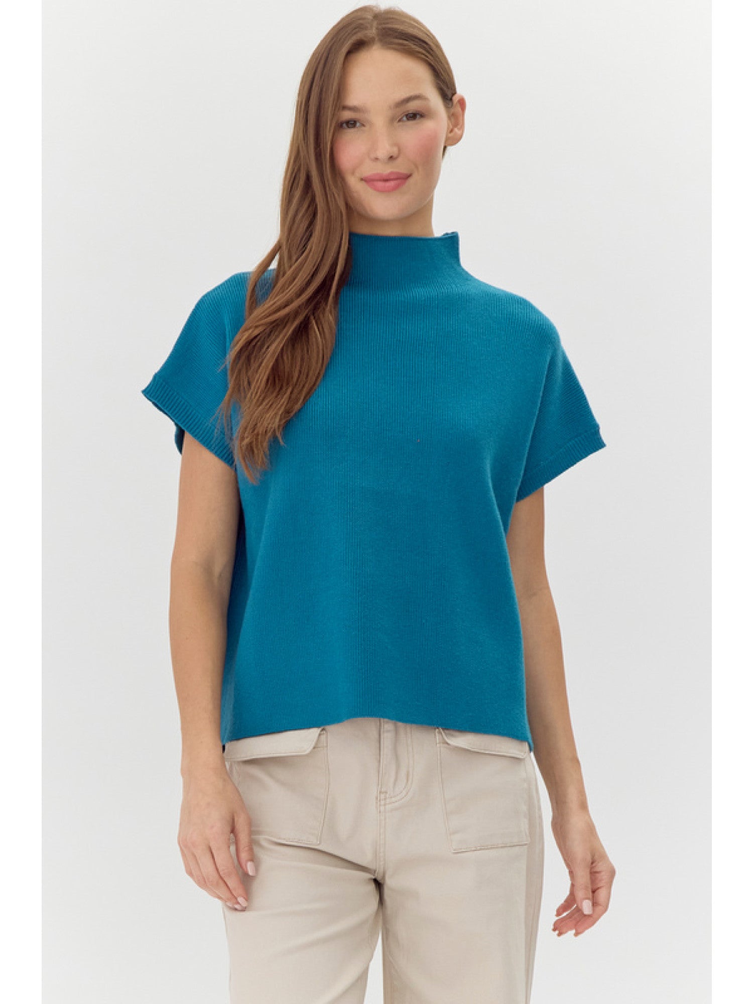 Ribbed knit top with mock neck, short dolman sleeves, side and cuffs slit detail.