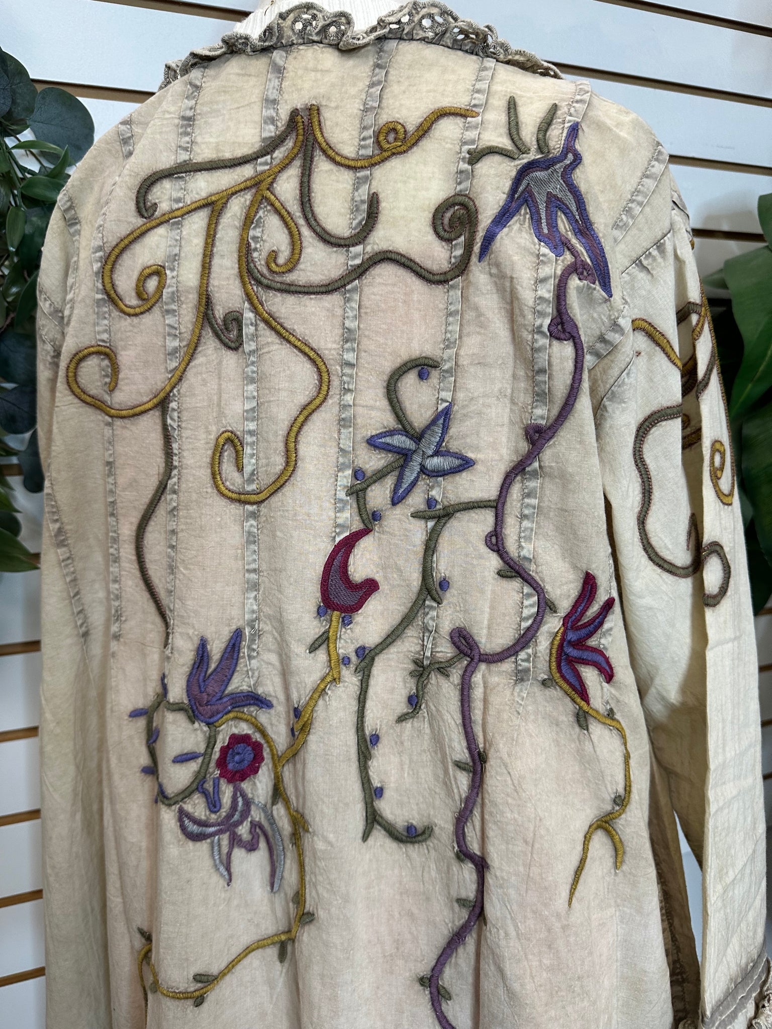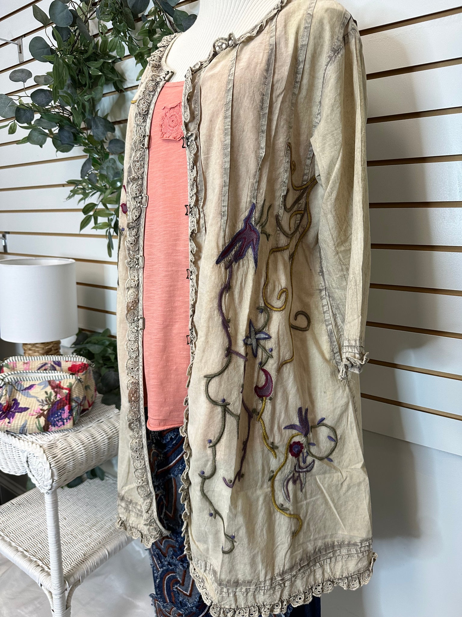 The Hold My Hand Cardigan combines boho-inspired charm with practical design. Crafted from 100% lightweight cotton, it offers breathable comfort and easy layering. Delicate embroidery with lace detailing enhances its artisanal appeal, while 3/4 sleeves and hip pockets add functional versatility. A hook closure down the front ensures secure wear without bulk, making this cardigan a refined choice for effortless style and comfort.