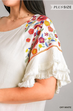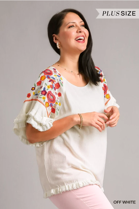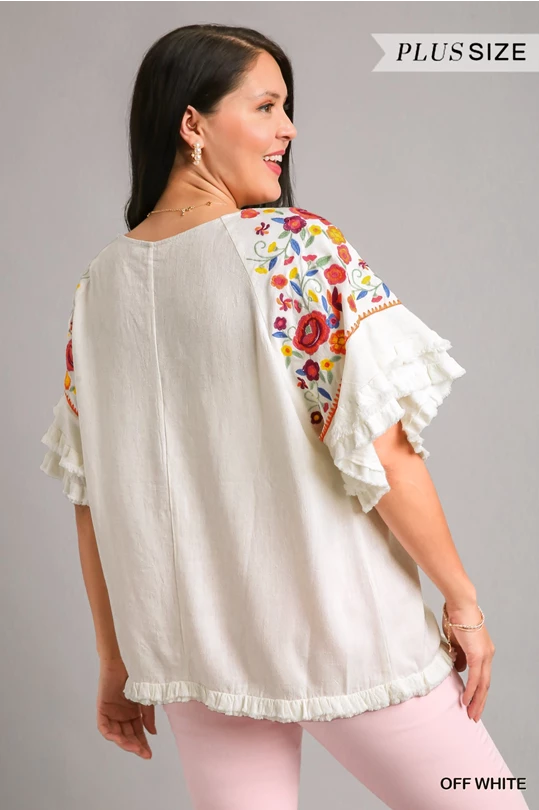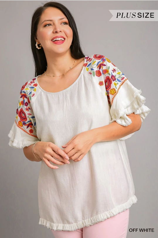 Embroidery Round Neck Top with Unfinished Frayed Hem • Not Lined.Fabric Contents:• 55% Linen • 45% Cotton