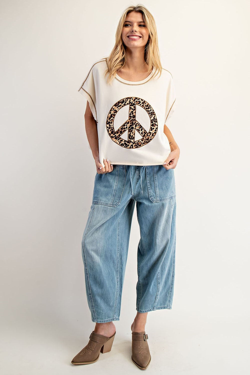 The On My Mind Top is the perfect blend of edgy and playful streetwear. Crafted from mineral washed fabric, this cropped tee features a bold leopard print peace sign applique. Wide raw edge armholes with contrast cover stitching give it a relaxed and boxy silhouette, while exposed seaming and a draped open back crossover detail add to its edgy look. Take your style to the next level with this unique and eye-catching top.