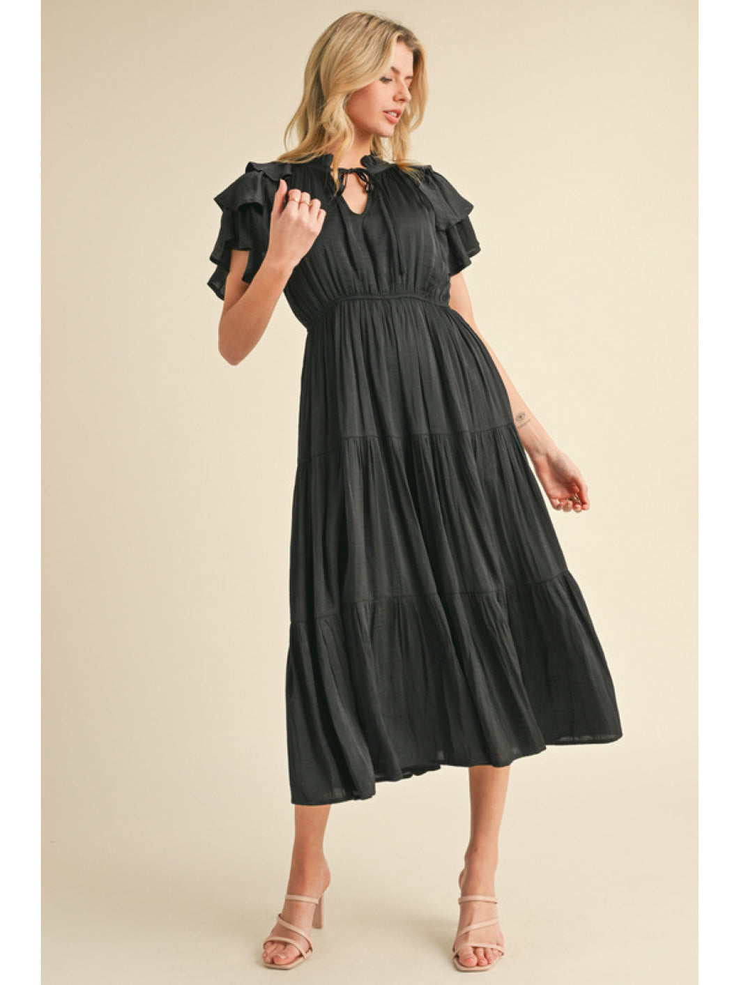 The One I Want Dress is a solid wrinkle-free midi dress featuring a frilled tie neck, ruffle details on the cap sleeves, and a tiered layer design. Made with lightweight, non-sheer fabric, this dress is perfect for any occasion. Crafted from 100% polyester for a comfortable and stylish look.