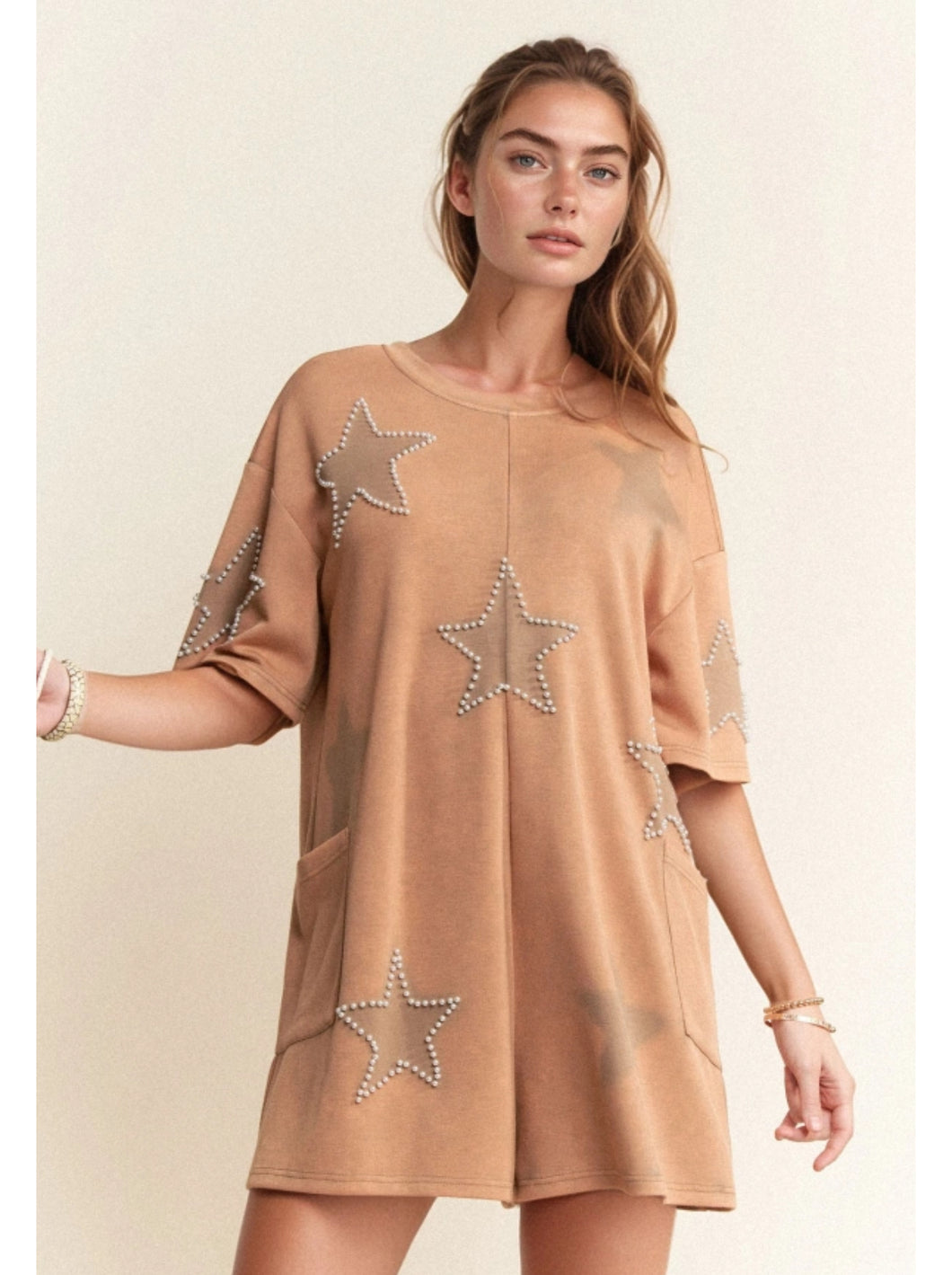 Expertly crafted from a soft knit material, this Star Studded Romper features vintage-inspired washed pearl detailing and charming star patches. Made from 100% cotton, this romper offers both comfort and style for any occasion.