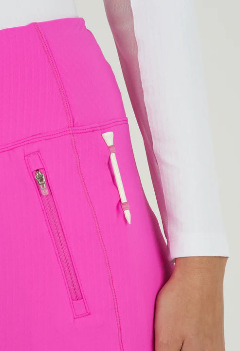 This skort provides ultimate style, comfort, and mobility for all your golf or leisure activities. We have your needs matched to a "T" with two loops on the left side to hold your tee while you make your way to the next hole. Zip pockets on the front, an invisible zip pocket on the right rear hip along with two more pockets on the inner short liner secures all your needed belongings. The buttery soft, stretchy patented IceFil Cooling Technology fabric lowers your skin temperature up to 5 degrees while protecting you from the sun's harmful UV rays. UPF 50+ sun protection, wicking, and anti-microbial features allow plenty of airflow to keep you cool, dry, and comfortable on the hottest humid days.