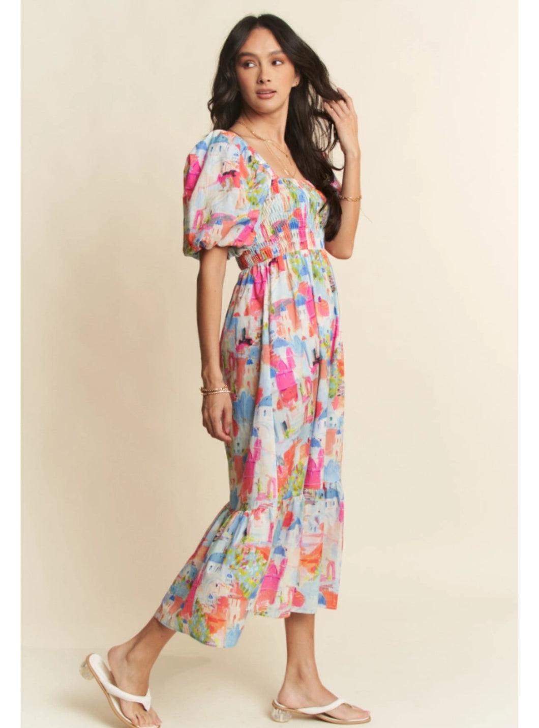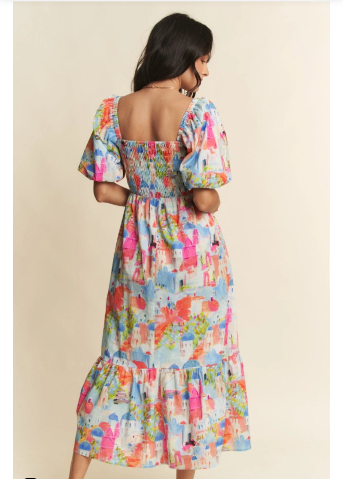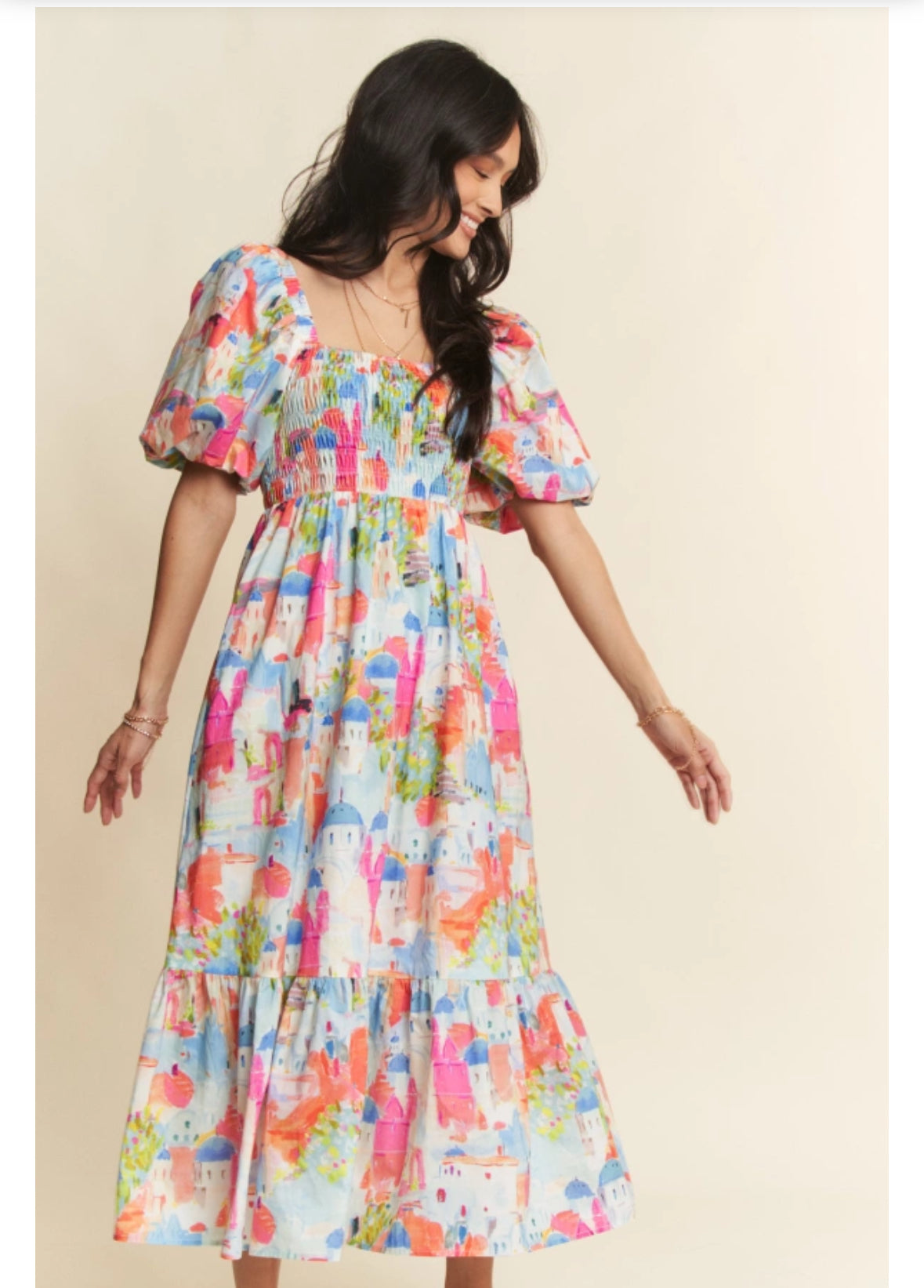 This lightweight and breathable dress features balloon sleeves and a smocking bodice, creating a comfortable yet flattering fit. Made from 100% cotton, it guarantees a soft and natural feel against the skin. Perfect for any occasion, this midi dress is a must-have for any wardrobe.