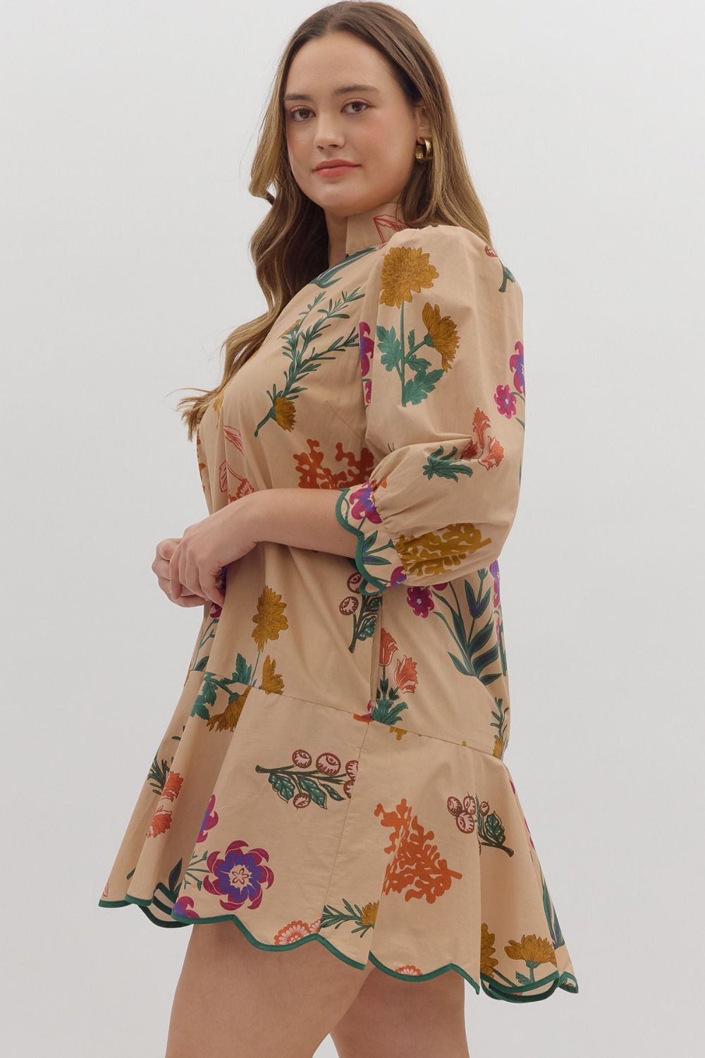 Floral print puff sleeve mini dress featuring V-neck and scallop hem. Pocket at side. Lined. Woven. Non-sheer. Lightweight. 100% cotton